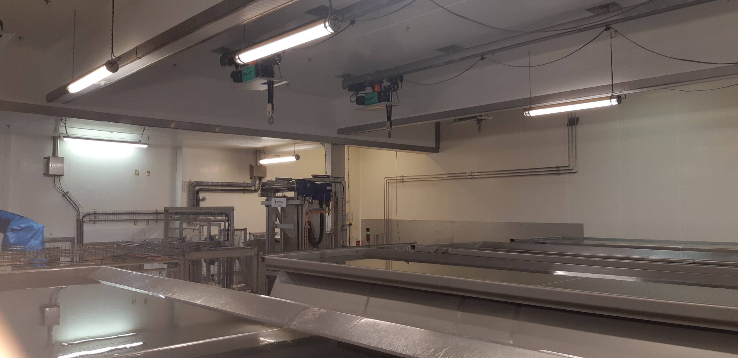 Outre l’optimisation de la partie levage, la réalisation comportait également des contraintes de structure spécifiques : en règle générale, un palan EUROLIFT BH se déplace sur un rail IPN mais la configuration de la salle de saumurage ne laissait pas assez de course au palan avec ce type de rail. Il fallait soit changer la structure existante et recalculer les charges de la charpente suspendue, ce qui représentait un coût élevé, soit adapter les palans. Verlinde a alors proposé de déporter le moteur du palan afin de gagner de la hauteur et ainsi de réutiliser les rails en profilé creux galvanisé existants.