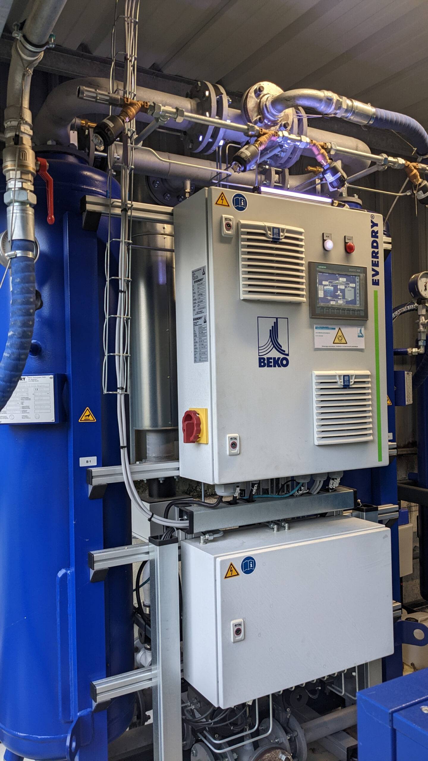 Le respect de la qualité alimentaire est donc un point crucial pour Laiterie Le Gall, d’autant qu’en 2021, elle a obtenu la certification qualité FSSC 22000 (Food Safety System) relative aux exigences en matière de sécurité alimentaire. Afin de continuer à la conserver, le client désirait renouveler son installation d’air comprimé vieillissante en vue de maintenir un air comprimé de classe de qualité [1:2:1] selon la norme ISO 8573-1 tout en réduisant sa consommation énergétique ainsi que ses coûts d’exploitation. Beko Technologies a été consulté pour une expertise technique, qui a pu proposer une solution sur-mesure.