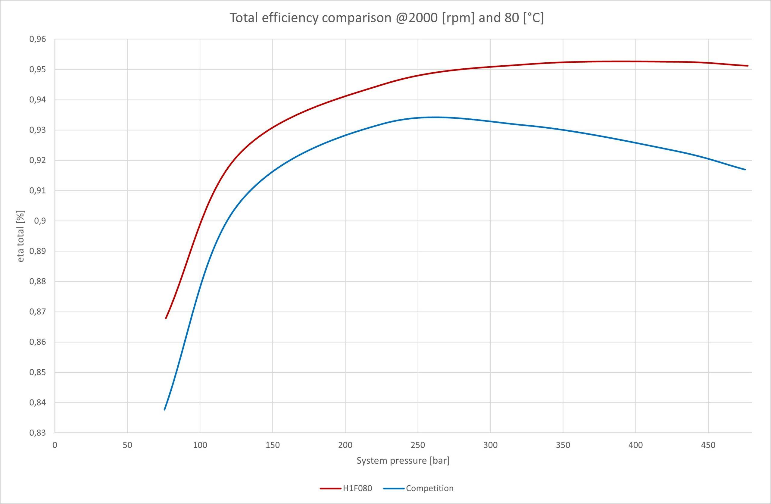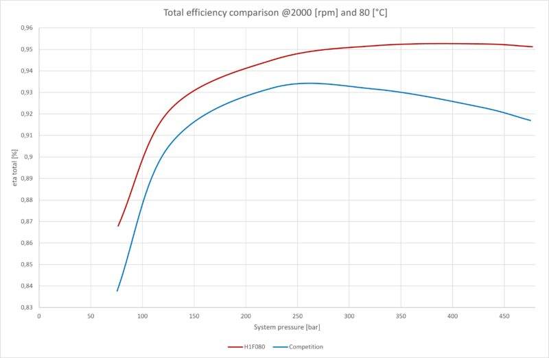Danfoss l’assure, en l’étayant avec le graphique ci-dessous : « le rendement global va jusqu’à 95 %, surpassant complètement la concurrence, quelle que soit la pression nominale ou la vitesse de rotation. »