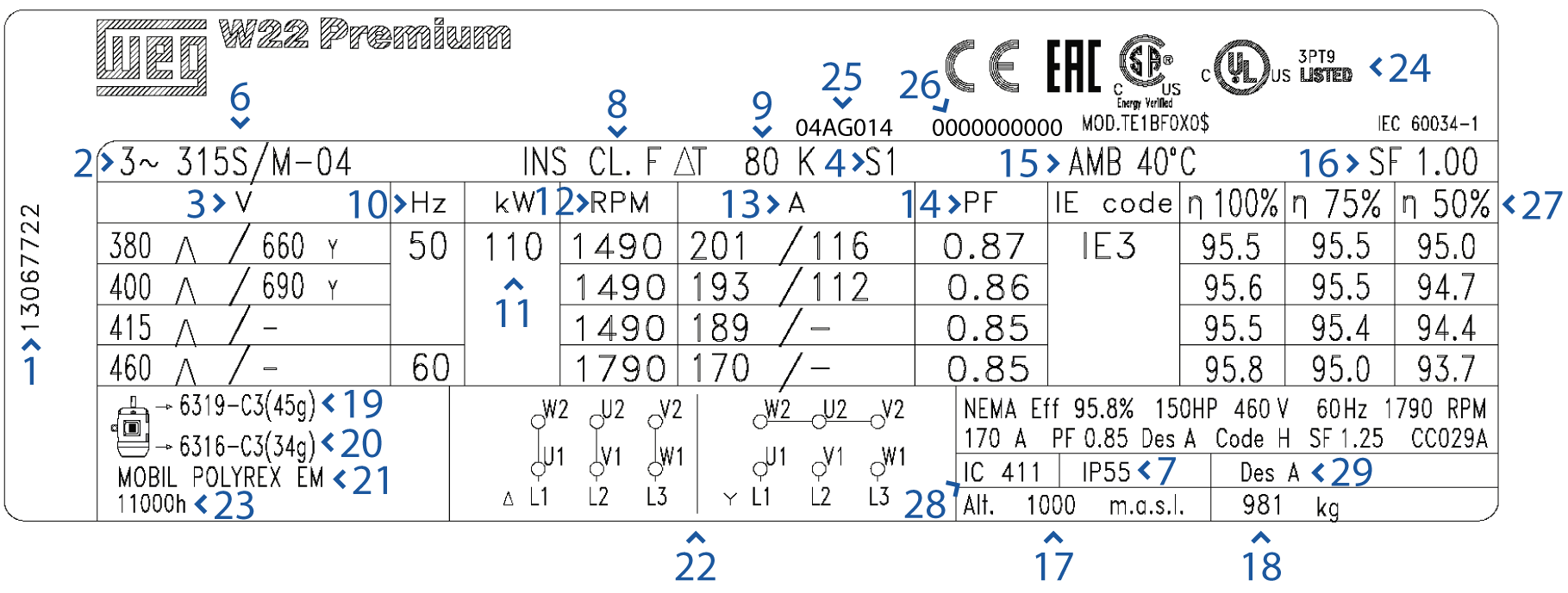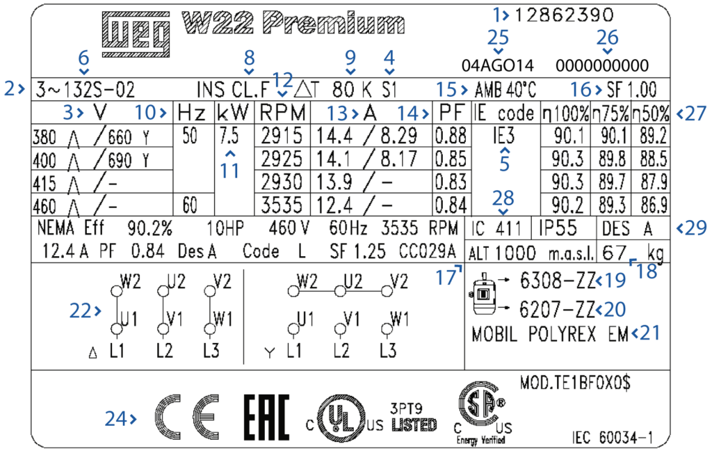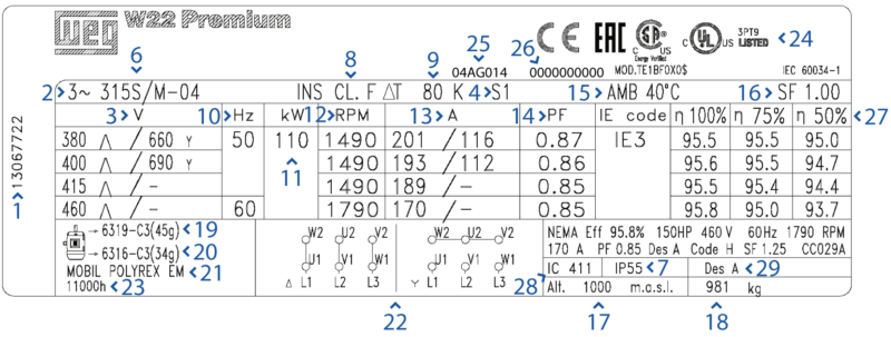Tout d’abord, il faut savoir que la première ligne de la plaque signalétique est consacrée au nom de la gamme du produit, et son niveau d’efficacité comme exigé par la norme CEI 60034-30-1. Sur l’image ci-contre, cela se traduit par « W22 » (nom de la gamme) et « Premium » (niveau d’efficacité). La disposition de notre plaque signalétique diffère en fonction des hauteurs d’axe. Vous trouverez ci-dessous les différents modèles de plaque signalétique utilisés pour les moteurs électriques WEG: