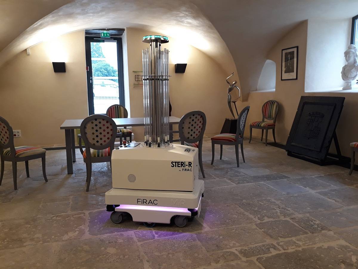Le module de désinfection Le STERI-R de l’entreprise FIRAC est monté sur un robot MiR100. Cela le rend autonome pour la désinfection les espaces de travail, de réception, de stockage… et garantir à toutes et à tous une sécurité sanitaire totale.
