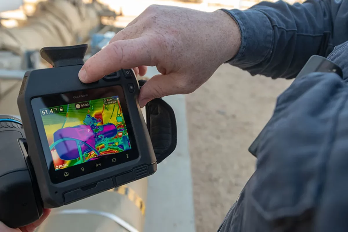 Les installations de biogaz sont vastes et comportent de multiples points de fuite potentiels, tels que les pompes à digestat, les vannes ou les joints de digesteurs. L’imagerie optique des gaz (OGI pour Optical Gas Imaging) utilise des caméras infrarouges spécialisées, filtrées pour correspondre à la longueur d’onde spécifique du méthane. Ces outils, à l’image des caméras FLIR de la série G, transforment les émissions totalement invisibles à l’œil nu en une image vidéo en temps réel, où le gaz apparaît sous forme de fumée.