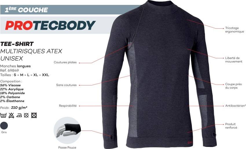 Après le lancement du Thermolactyl « Activ Body 4 » en 2020, Damart Pro dévoile sa dernière innovation: ProtecBody. Ce nouveau tee-shirt unisexe et seamless (sans couture, tricotage 3D) s’affirme en réponse multirisques de pointe : retardateur de flammes, antistatique, arc électrique et travail en zones Atex (atmosphères explosives).