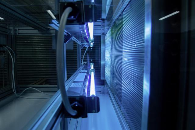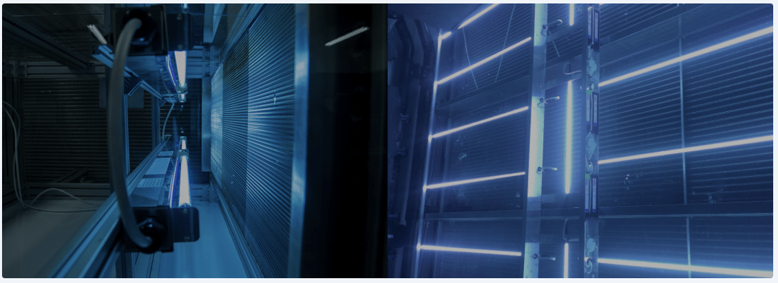 Cette approche est adoptée dans plusieurs gammes de « centrales de traitement d’air » (CTA) : on installe souvent les lampes UVC en aval de la batterie froide (ou chaude) et au-dessus du bac de récupération des condensats. Dans ce positionnement, les micro-organismes adhérents aux ailettes et surfaces reçoivent une dose d’irradiation directe. Le défi technique consiste à fournir une dose d’énergie (J/m²) suffisante — compte tenu du débit d’air, de la vitesse, de l’humidité — sur un temps de passage souvent très bref.