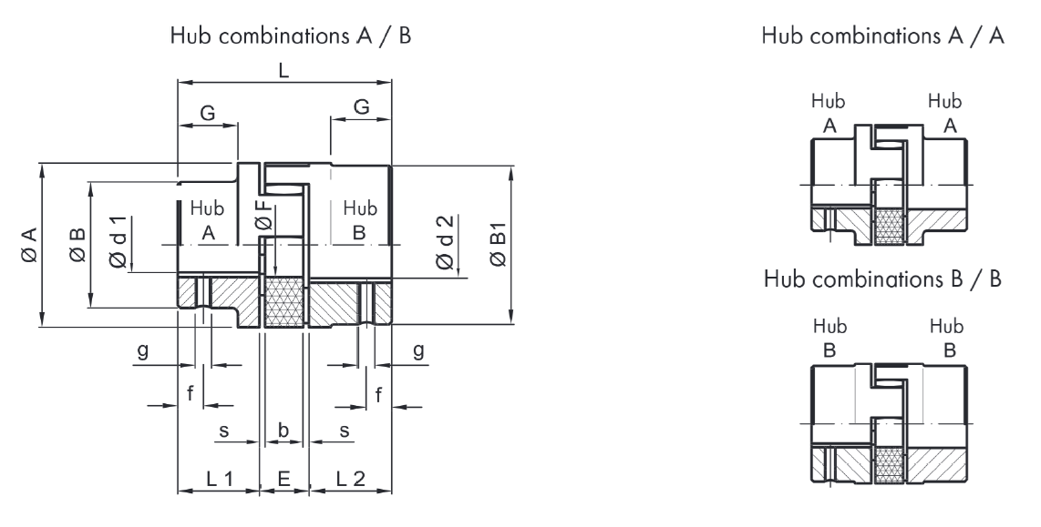 Des 3 parties constitutives d’un accouplement élastique Softex®, les deux moyeux peuvent être dans différentes matières (Aluminium ou acier fritté pour les petites tailles et fonte ou acier pour les tailles les plus grandes). Ils peuvent être livrés avec différents usinages de finition au niveau des alésages (cylindrique ou conique, métrique ou impérial).