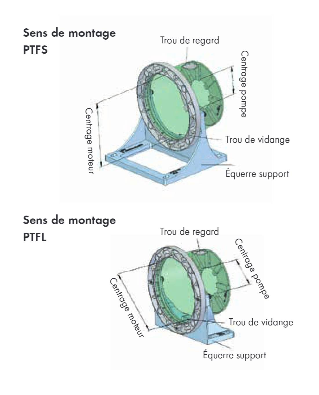 La lanterne, livrée prête à l’emploi, s’insère entre le moteur et la pompe. En se fixant sur la bride de chaque élément, elle permet un alignement correct entre ces deux éléments. Le dispositif (lanterne + accouplement) s’adapte à toutes les marques de pompes et moteurs. Certaines lanternes sont normalisées et d’autres peuvent être réalisées à la demande.