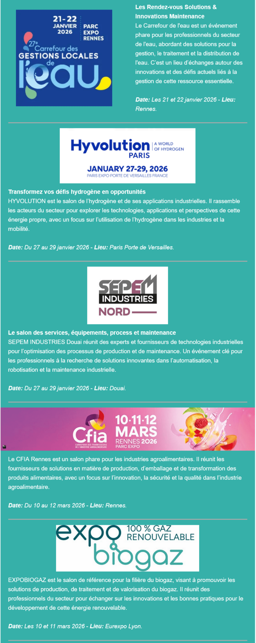 Les principaux salons industriels sont présents dans notre guide pratique, avec leurs dates mises à jour : Le Carrefour de l’eau, MicroNora, Hyvolution, les SEPEM INDUSTRIES, CFIA Toulouse, Global Industrie, BIOKET, ENERGY CLASS FACTORY, Forum EnerGaïa, VRAC Tech / BULK Tech, POLLUTEC, Intermaintenance, PCH MEETINGS, BE 4.0, PREVENTICA, Pump and Valve, ANALYSE INDUSTRIELLE, PHARMACOSMETECH, SIDO, EXPOBIOGAZ… ici notre guide.