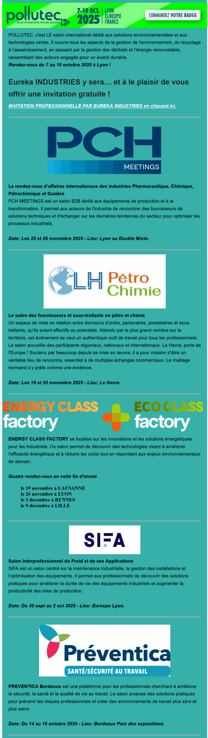 La société Eureka Industries agit depuis 30 ans au cœur des sites industriels. Elle est éditrice du site Éléments Industriels et du magazine Eureka Flash Info, mais également réputée pour ses formations techniques. Elle est présente sur plusieurs de ces salons afin de venir à votre rencontre, présenter ses nouveautés, ses formations et d’écouter vos attentes.
