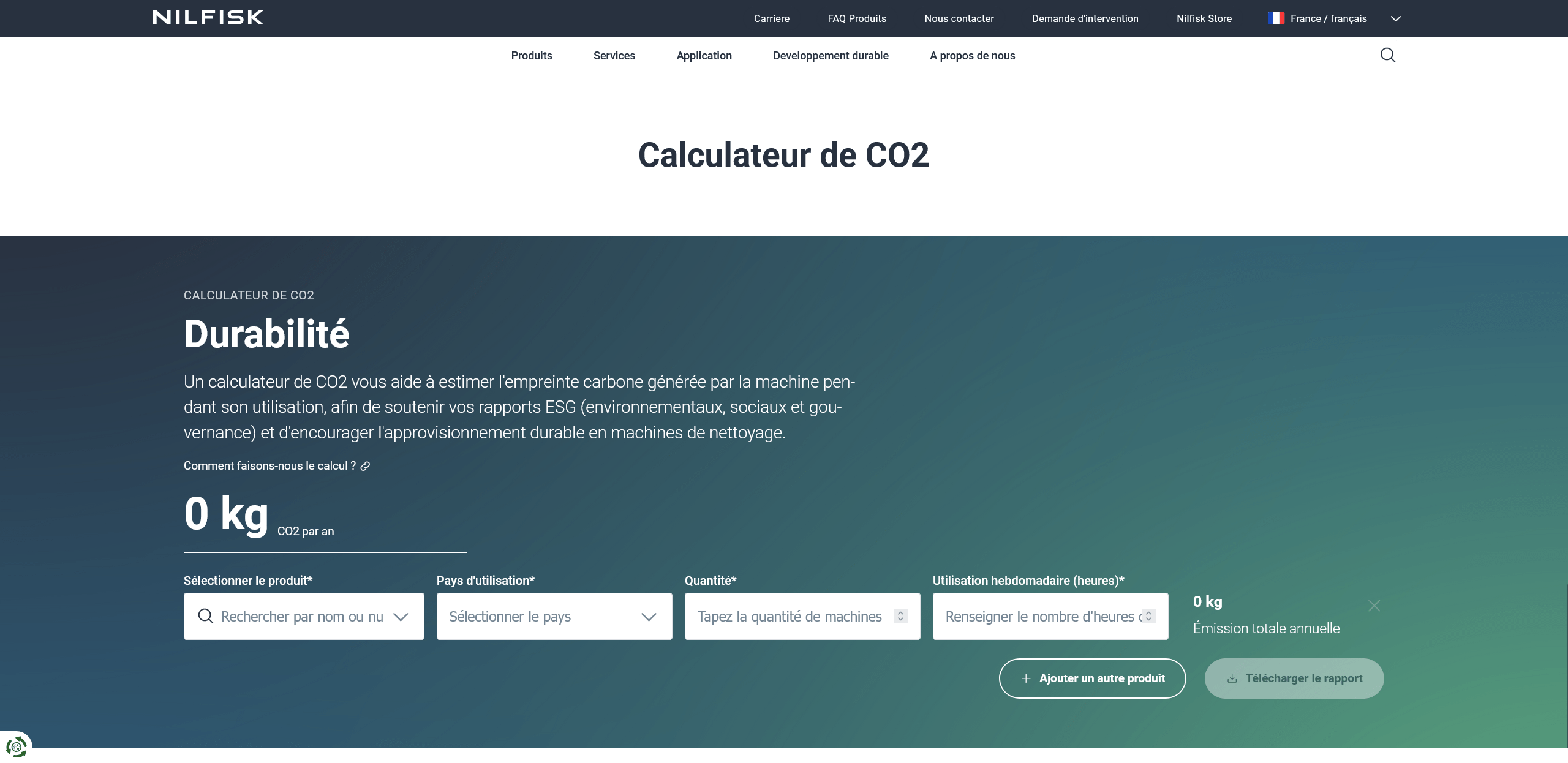 L’outil estime les émissions en kg CO₂/an pour chaque machine Nilfisk en fonction de trois paramètres :