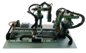 Dans cette application, l´automate de manutention est commandé par un moteur pas à pas et utilise un entraînement par courroie dentée en combinaison avec une vis à billes pour le convoyage de composants sur l’axe horizontal. Développé pour montrer un transfert le long d´un axe vertical, une table de positionnement circulaire a été choisie pour l’alimentation en pièces sur les deux axes.