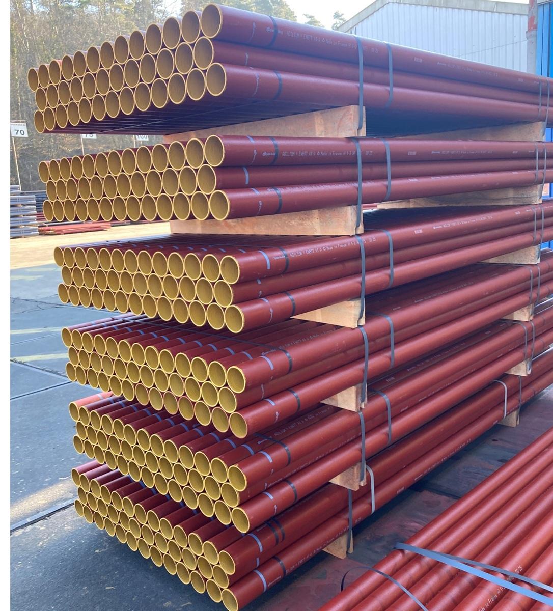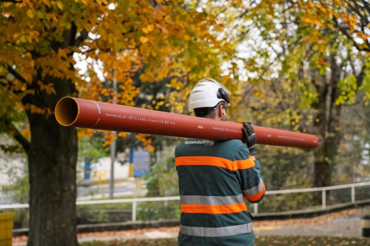 Ce process réduit le volume de matière sans compromettre les performances : le tuyau 3 m (Ø 50 mm) pèse 10,2 kg au lieu de 12,3 kg (−17 %) ; le Ø 75 mm pèse 13,6 kg contre 18 kg (−25 %) par rapport à une gamme standard Pam Building. La réduction du poids permet une manutention, découpe et pose facilitées sur chantier.