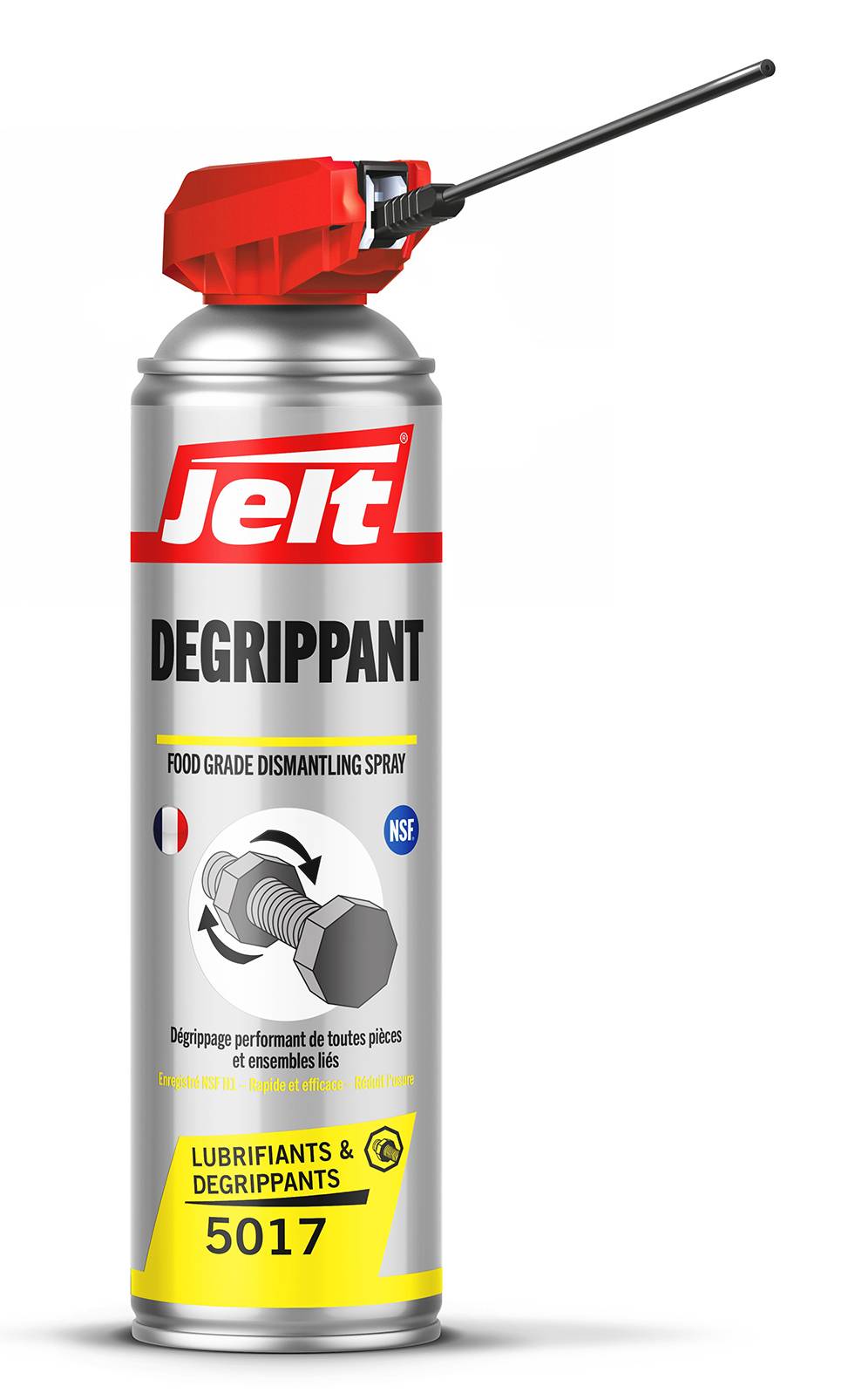La marque Jelt présente son nouveau produit, le Dégrippant Alimentaire. Ce dégrippant professionnel rapide et efficace, au large champ d’applications, a été conçu pour assurer le dégrippage de toutes pièces ou ensembles liés dans les zones où le risque d’un contact fortuit avec des produits alimentaires est possible.